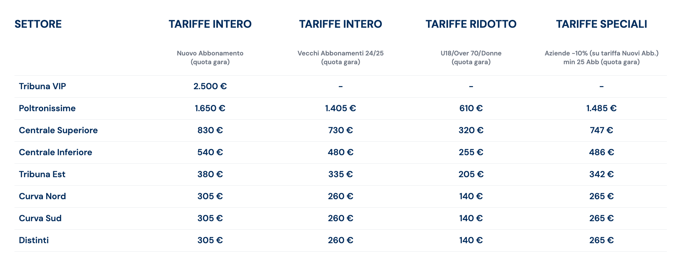 Si rammenta che gli abbonati della stagione 24/25 che non rinnoveranno l'abbonamento durante la prima fase di prelazione manterranno, anche nella fase di vendita libera, il diritto alla tariffa riservata ai vecchi abbonati. Tuttavia, perderanno il diritto alla riconferma del posto della scorsa stagione.